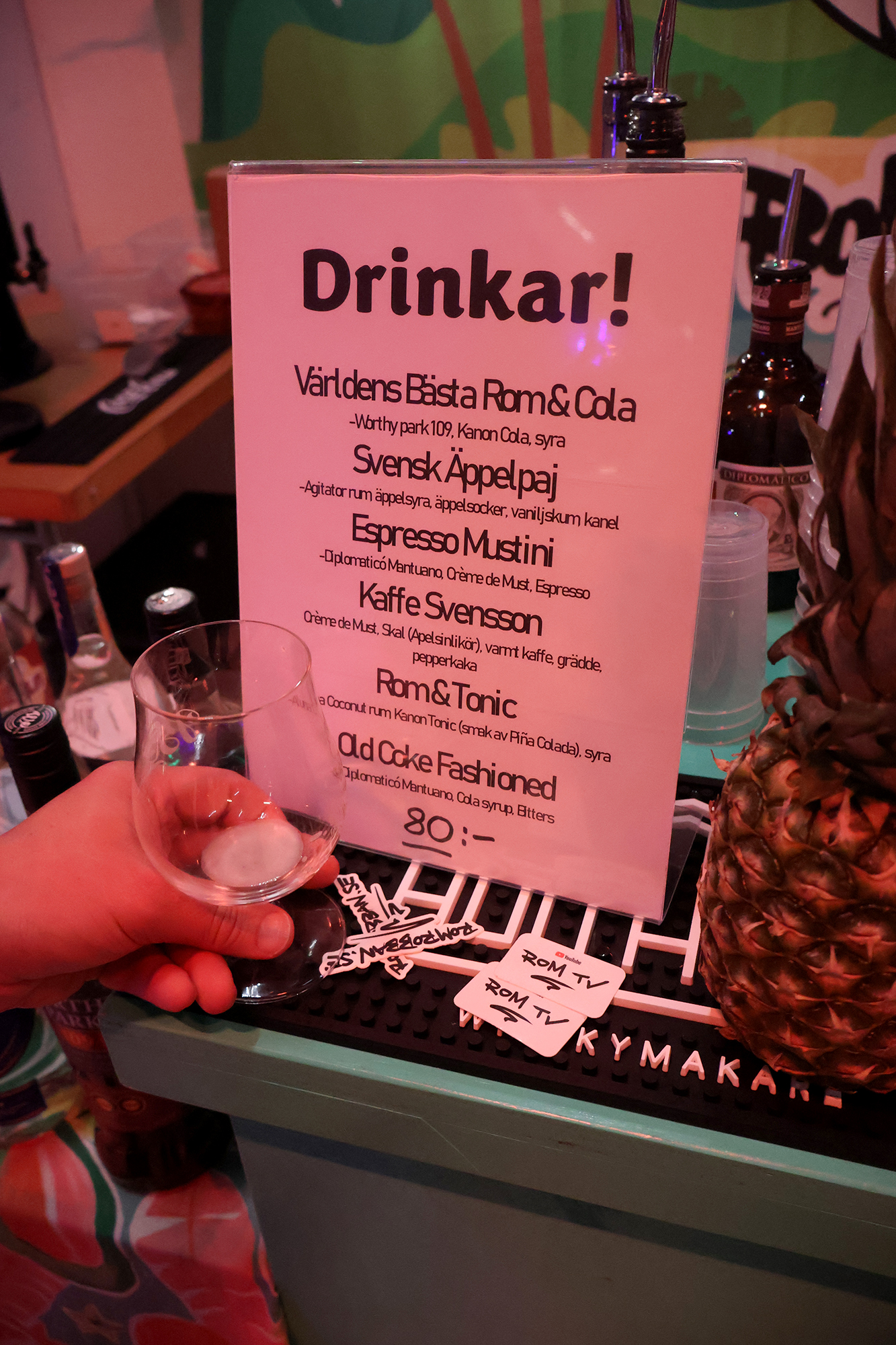 Kiertelimme tapahtumasalia, jossa maistelin välillä drinkkkejä, välillä viinoja, vaimon keskittyessä parin viinin maisteluun. Viinamaistiaiset ja drinkit maksoivat yleisesti 60 SEK (5,40 €) ja 80 SEK (7,20 €) välimaastossa. Söimme myös herkullista BBQ-ruokaa sitä myyneeltä kojulta. Kiersin salin myös toisen kerran videoiden koko kierroksen ja voit katsoa sen videon alta tai YouTubesta. Tapahtuman lopuksi osallistuimme RomRobbanin järjestämään rommitastingiin, jossa maistelimme kuutta rommia ja kuulimme tarinaa rommista yleisesti, sen historiasta, valmistuksesta ja tietenkin myös Robbanista itsestään. Tunnin kestänyt tasting oli mielenkiintoinen ja loppuunmyyty yhtä paikkaa lukuunottamatta (49/50).
