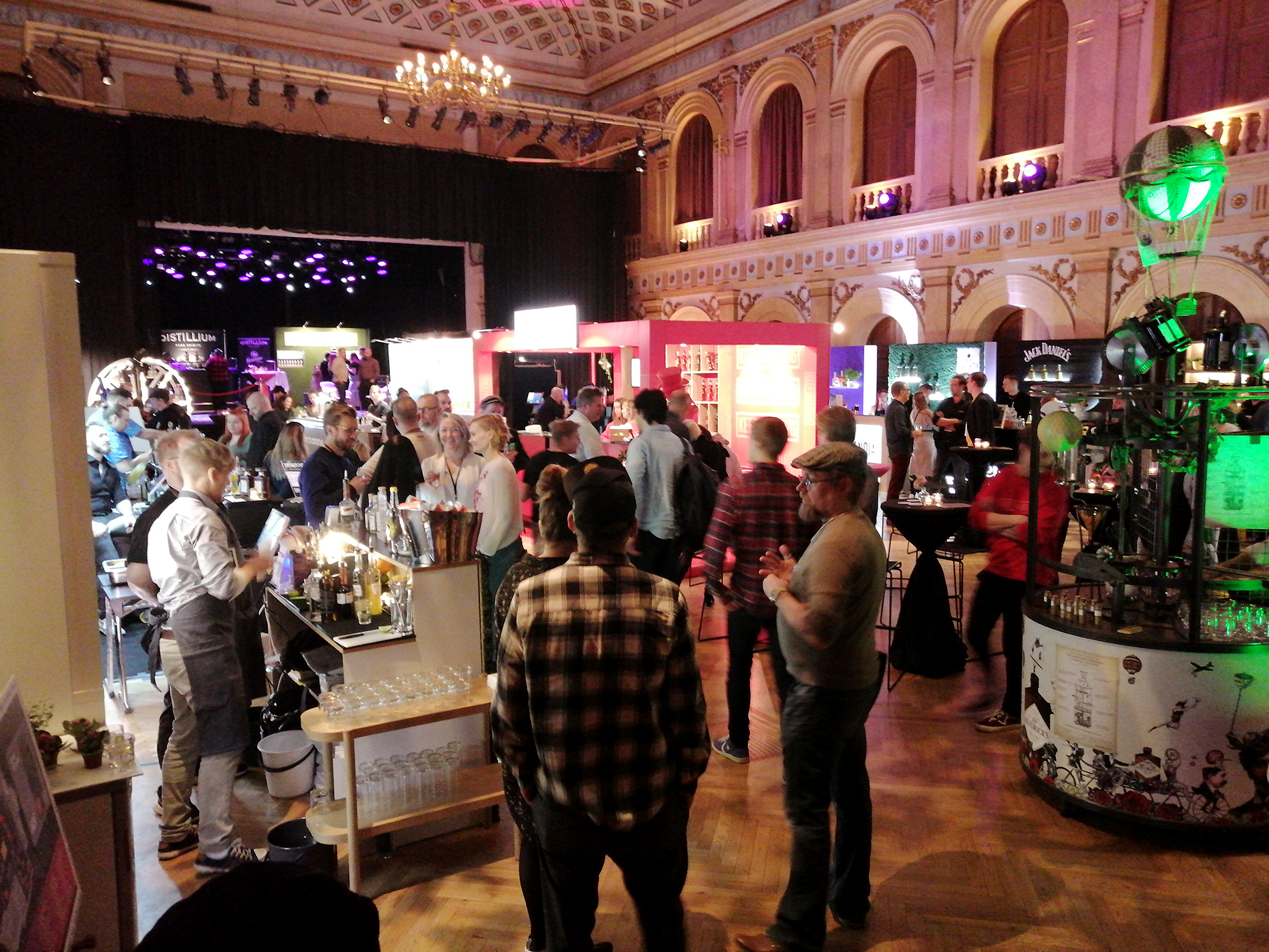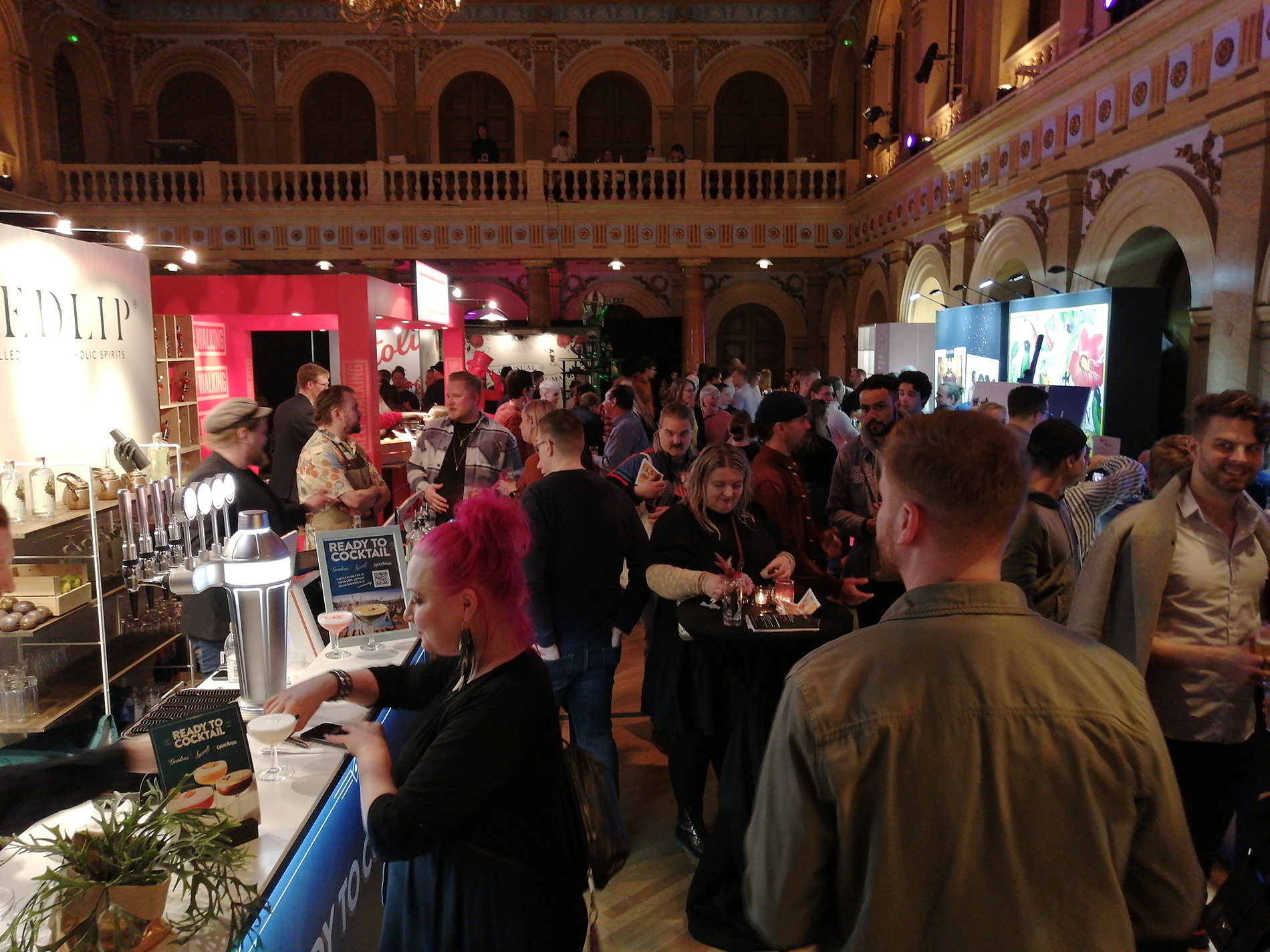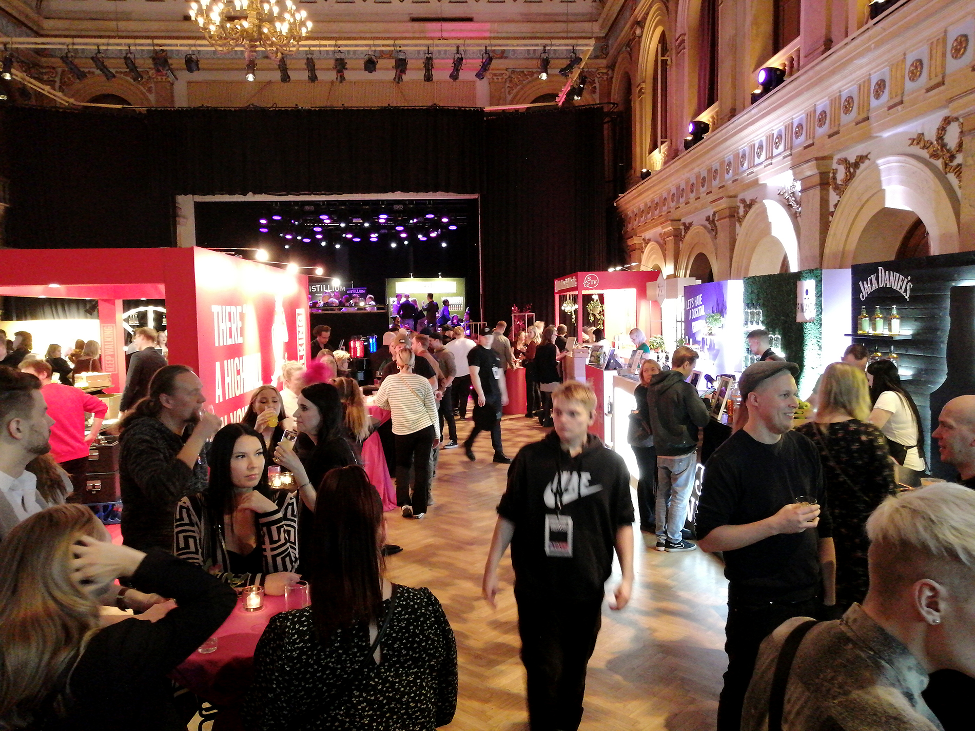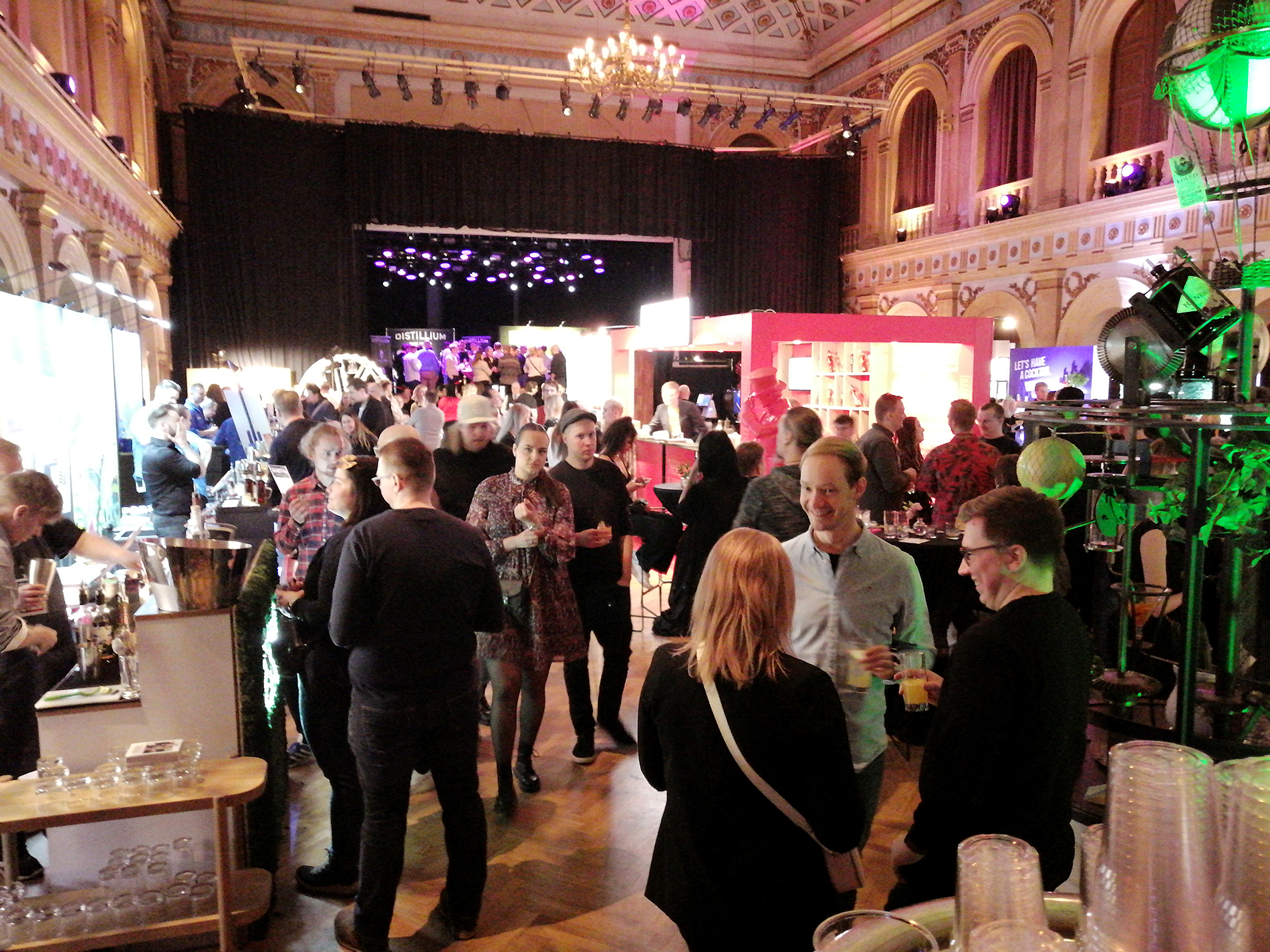 Tapahtuma koostui kaiken kaikkiaan 34 ständistä, joista suurimmalla osalla viinojen tai miedompien alkoholien maahantuojat tai valmistajat esittelivät tuotteitaan. Miedompia alkoholeja esiteltiin tosin vain viidellä ständillä, väkeviä 14:llä. Heidän lisäksi näytteilleasettajissa oli seitsemän helsinkiläistä (?) cocktail-baaria, pari alkoholittomia viinankorvikkeita esittelevää yritystä, viinanlaimennuskoneen valmistaja, lantrinkifirma, kahvifirma, pari ruokakojua ruokavähemmistöille ja valmisdrinkkejä hanasta -firma. Lisätietoa näistä selviää selaamalla kuvagalleriaa jäljempänä.