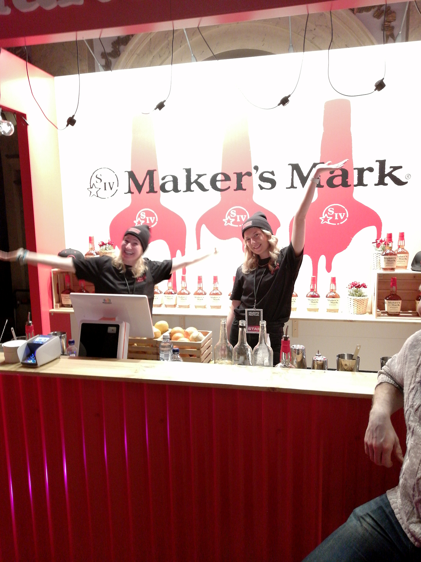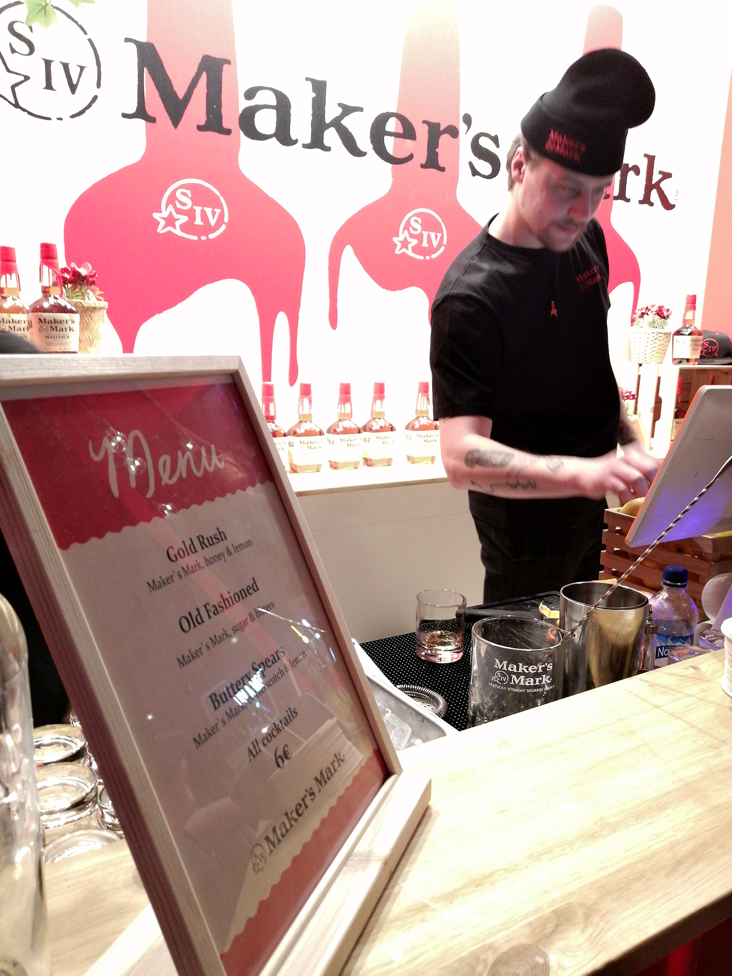 Maker's Mark -bourbon oli panostanut mm. pipoihin. Kuvassa myös heidän festarimenyy vaikeasti luettavana.