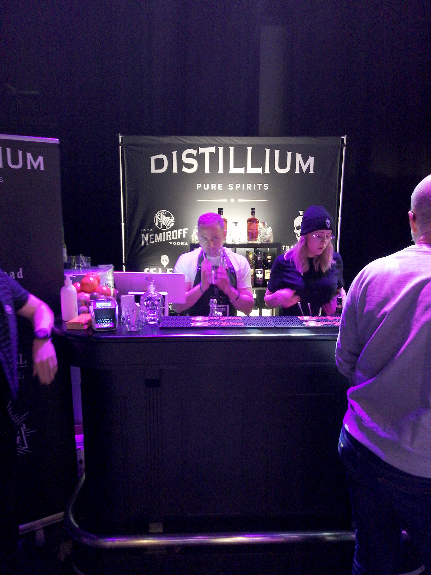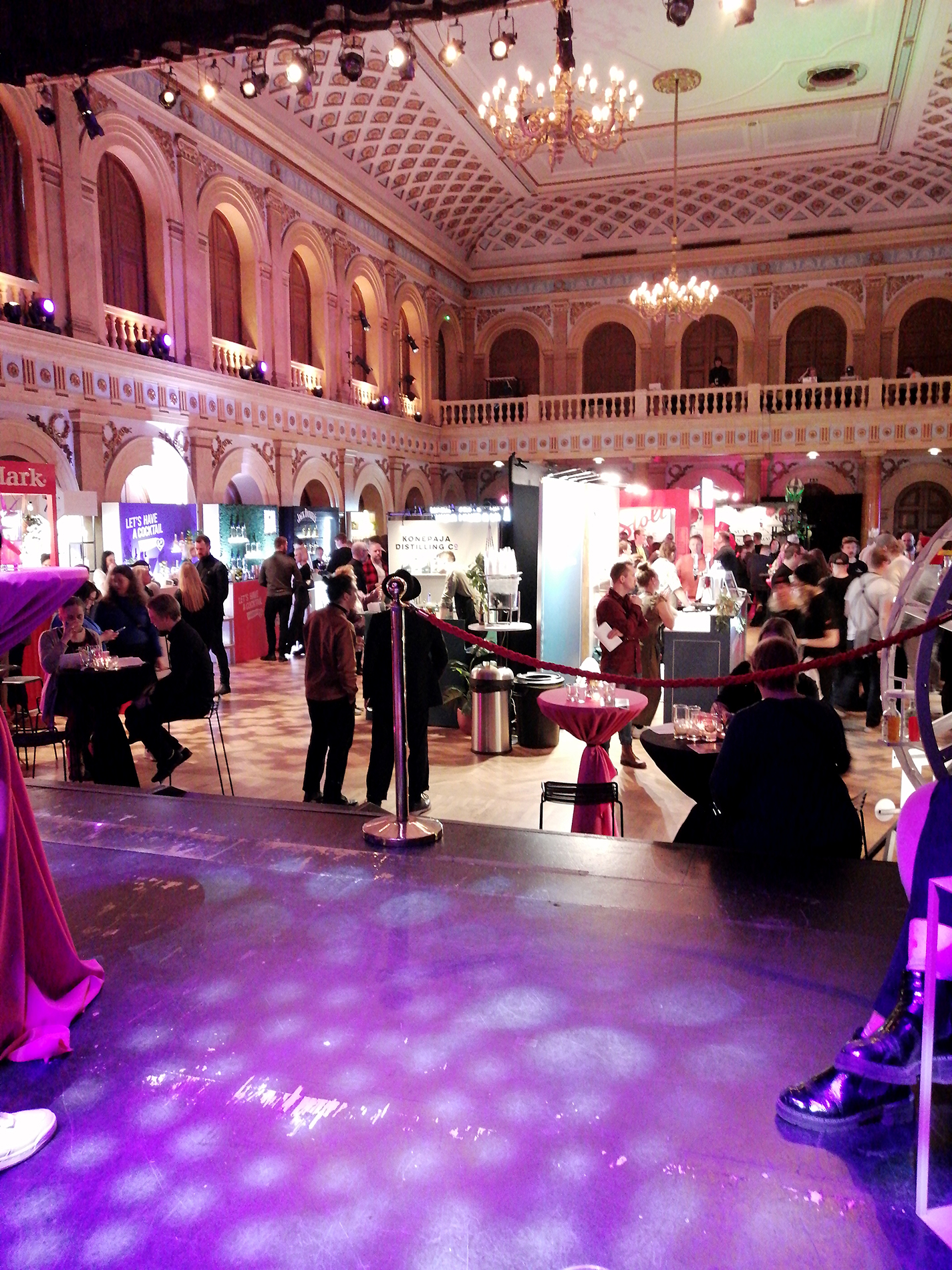 Jokaisella kojulla oli myynnissä vähintään kolme erilaista drinkkiä, joissa pääosassa oli luonnollisesti se heidän edustamansa tuote. Yläkerrassa sijainneiden cocktail-baarien omilla kojuilla ei oltu sidottuja mihinkään tiettyihin tuotemerkkeihin ja siellä drinkit olivatkin monipuolisempia ja monimutkaisempia kuin alakerrassa. Pääasiassa myös maukkaampia. Hehän olivat kuitenkin drinkinvalmistuksen ammattilaisia. Kaikki drinkit kaikilla kojuilla maksoivat 6€ / kpl ja ne olivat puolikkaita. Puolikkaat drinkit mahdollistivat mm. sen, että minä maistoin yhteensä 21 erilaista drinkkiä muutamien raakana tarjottujen maistiaisten lisäksi.