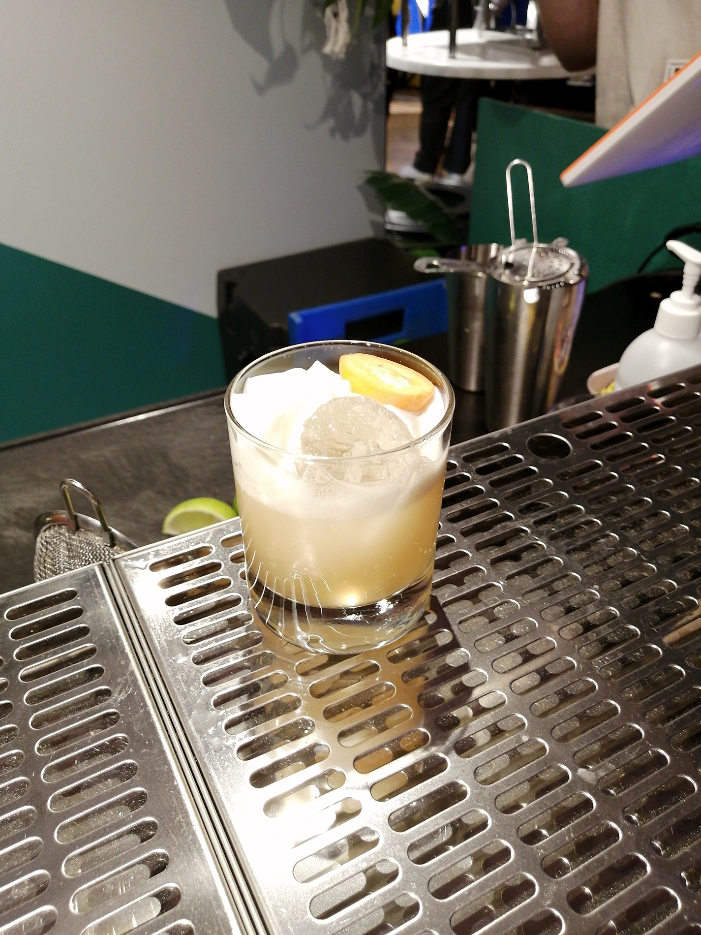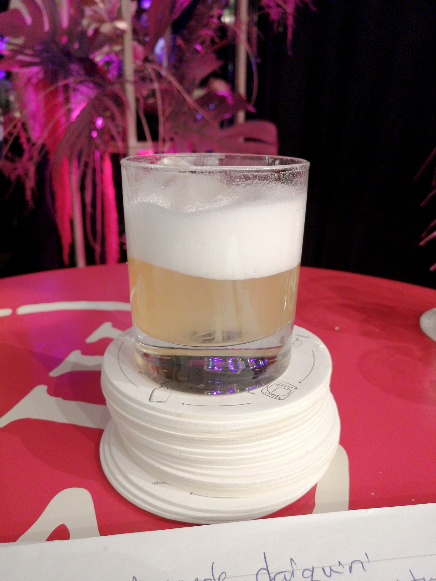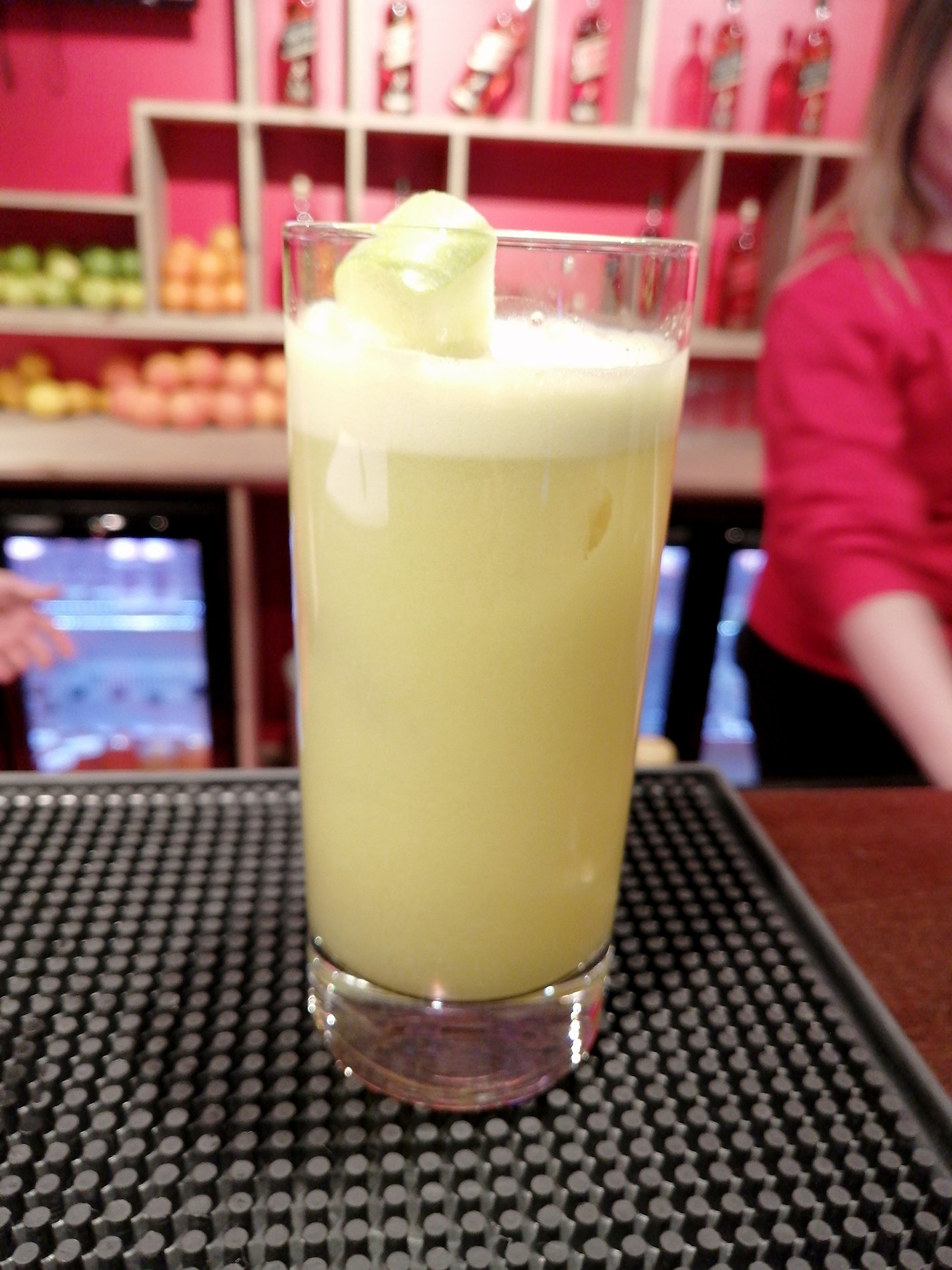 De Kuyper Rhubarb Sour. Pinnalla vegaaninen vaahdottaja Foamee. Drinkki oli makea ja raikas, hieman hapan. Pääaineena raparperilikööri, jossa 15% alc.