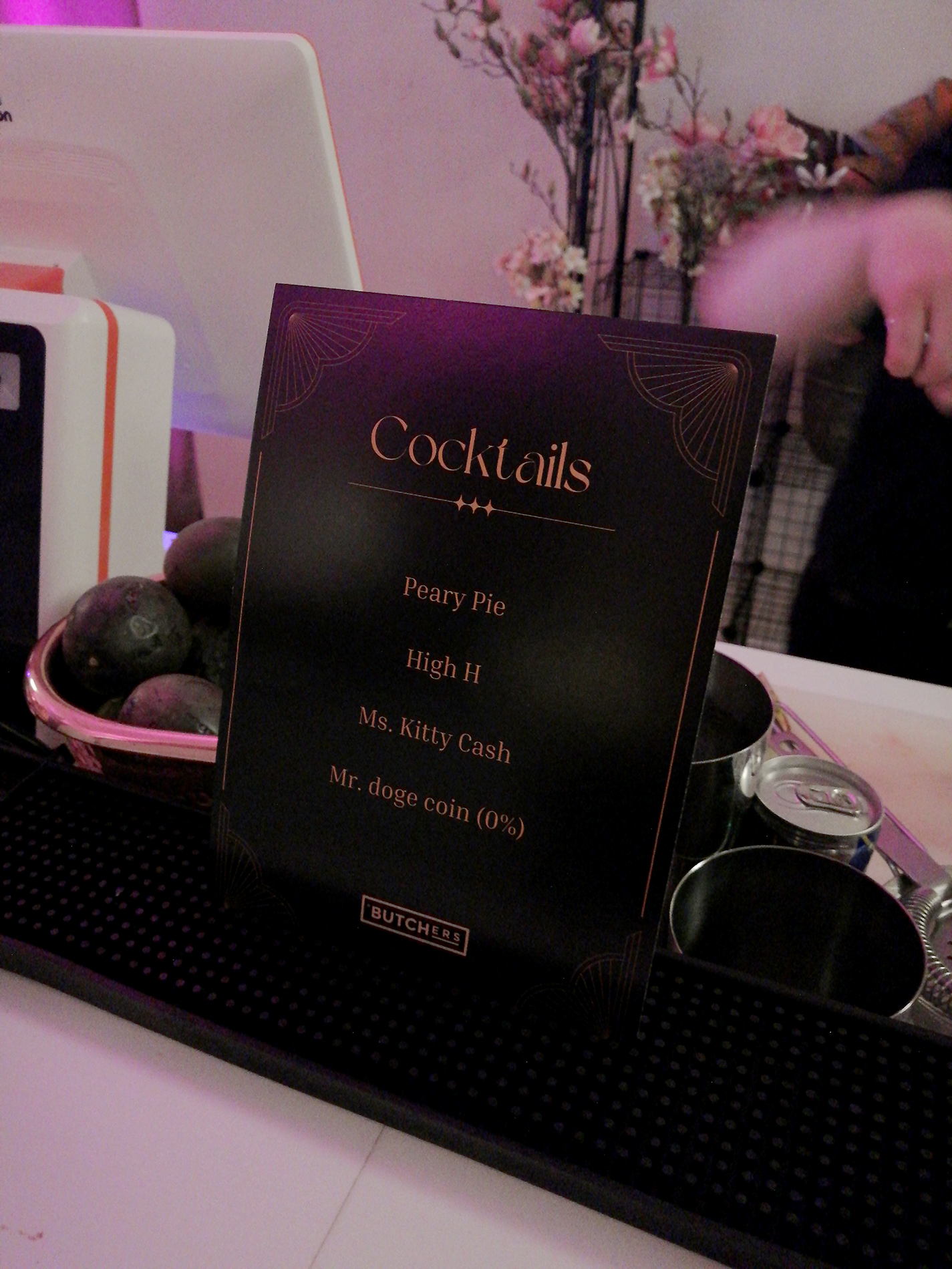 Butchersin festarimenyy. Olisin kaivannut ainesosat menyyseen, vaikka ne suullisesti kerrottiinkin. Maistelin Peary Pien, joka oli makea, päärynäinen ja kermainen eli oikeastaan karkkia nestemuodossa.