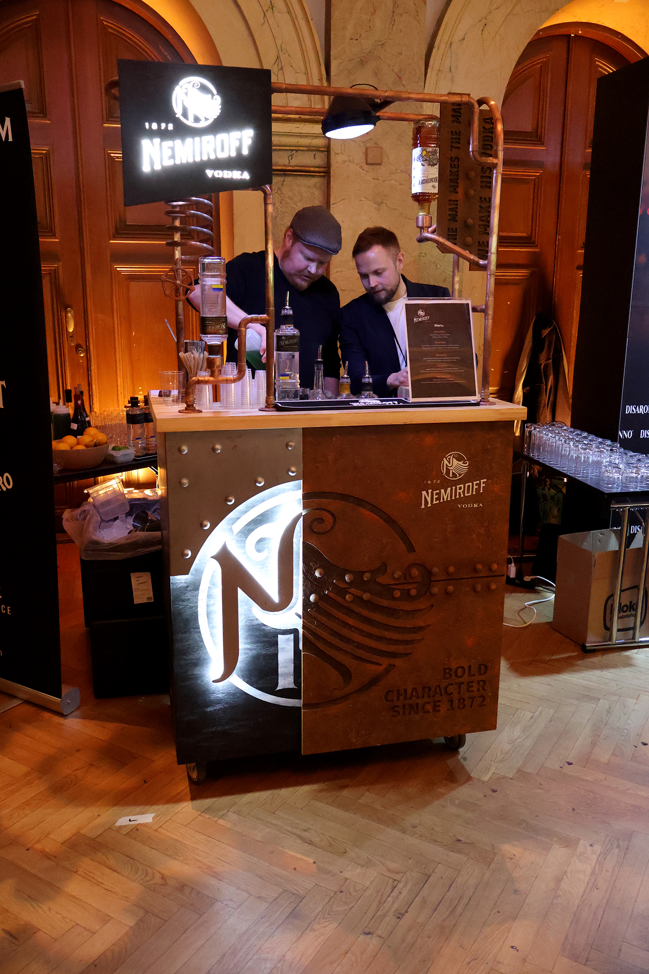 Perjantaina kävelimme Mannerheimintien yli pian kello 16 jälkeen ja astelimme sisään nyt jo tuttuun vanhaan ylioppilastaloon, viritin kuvauskalustoni vireeseen ja aloitimme kierroksen. Alakerrassa, tapahtuman suurimmassa tilassa, näytteilleasettajina oli pääasiassa alkoholien valmistajia, maahantuojia ja edustajia. Yläkerrasta löytyi laskutavasta riippuen 3-5 cocktailbaarin ständit sekä tila, jossa järjestettiin jonkin sortin cocktail-kisa, jonka voittaja jatkaa kansainvälisille areenoille… mutta se homma meni minulta pääasiassa ohi.