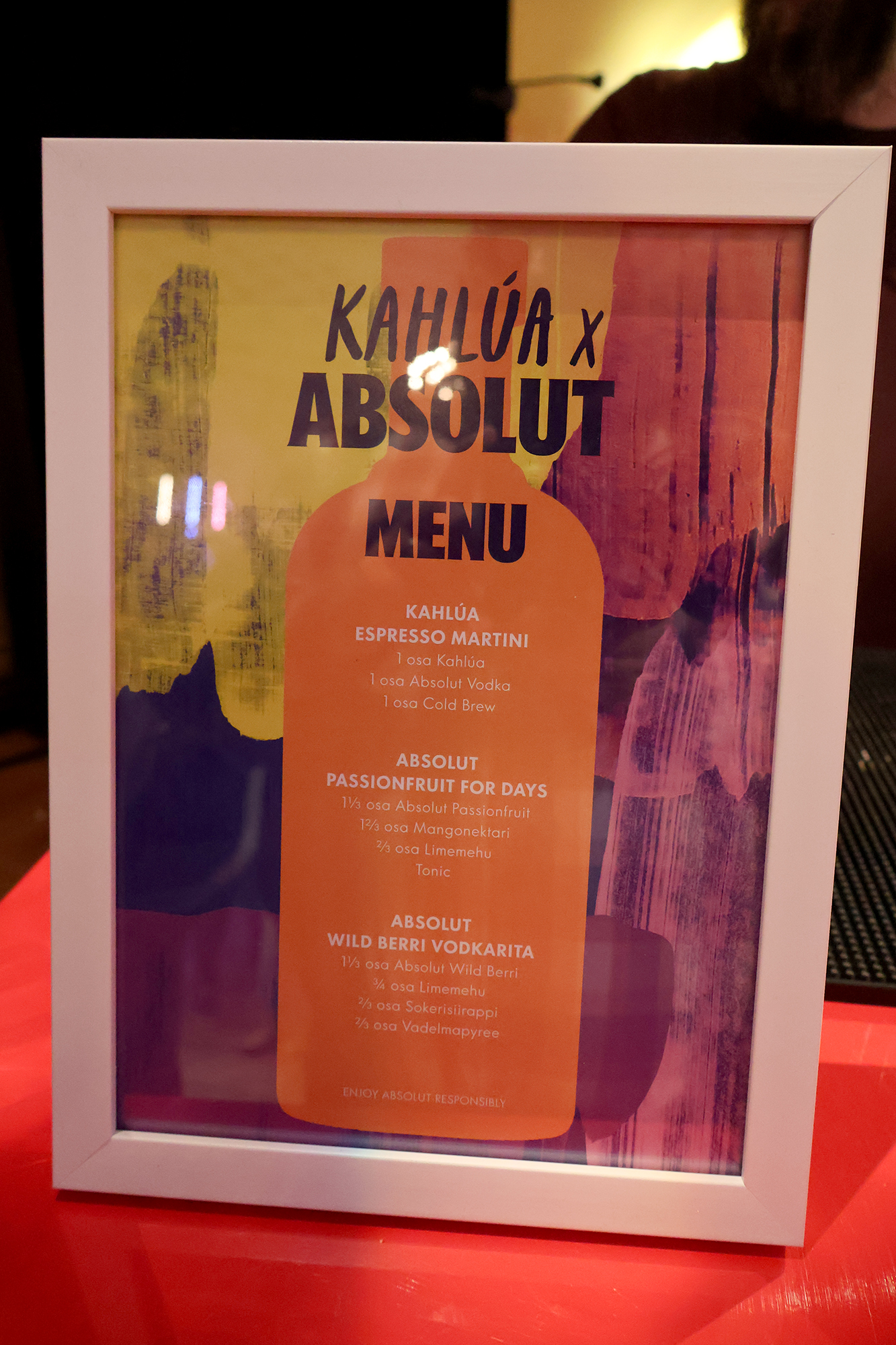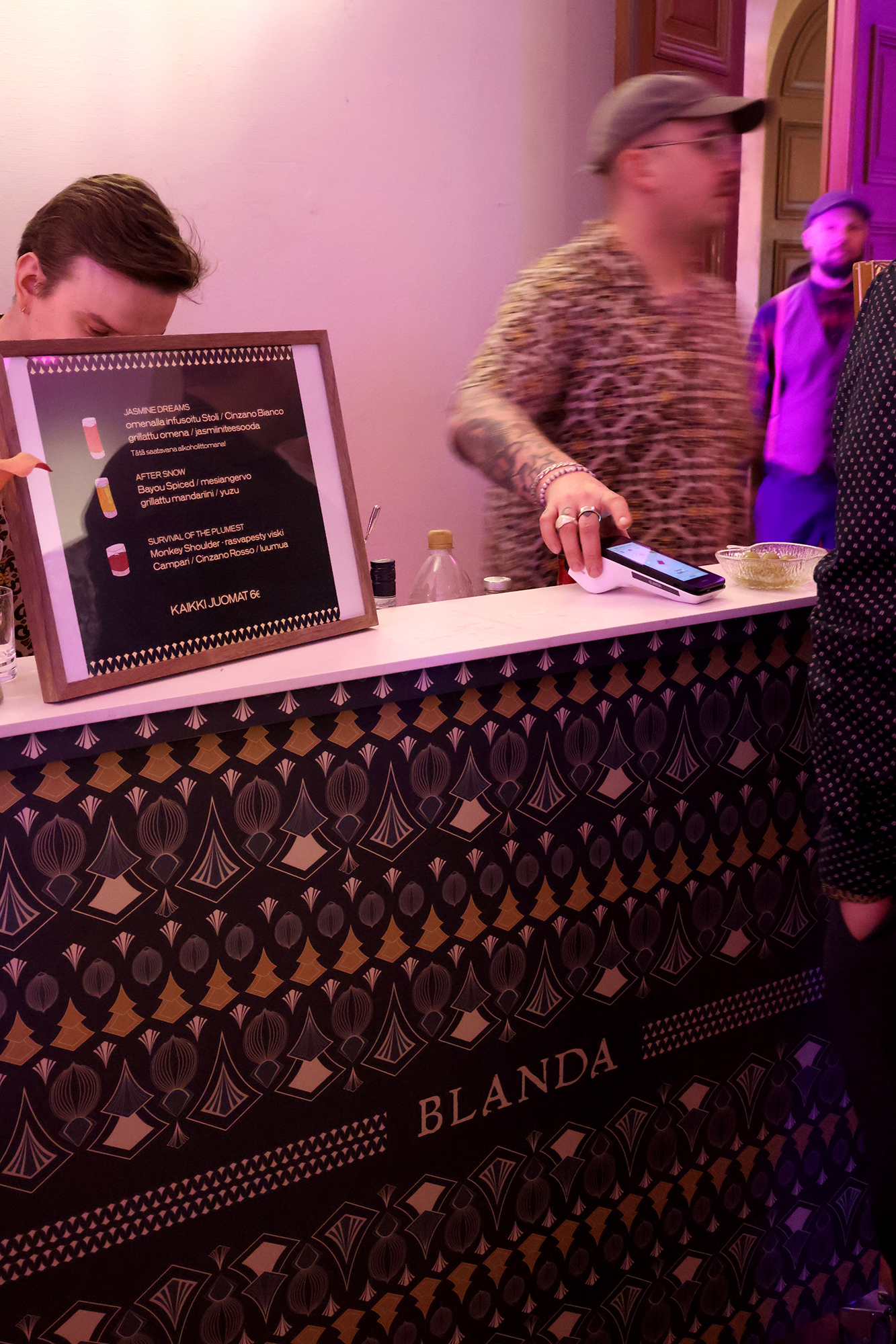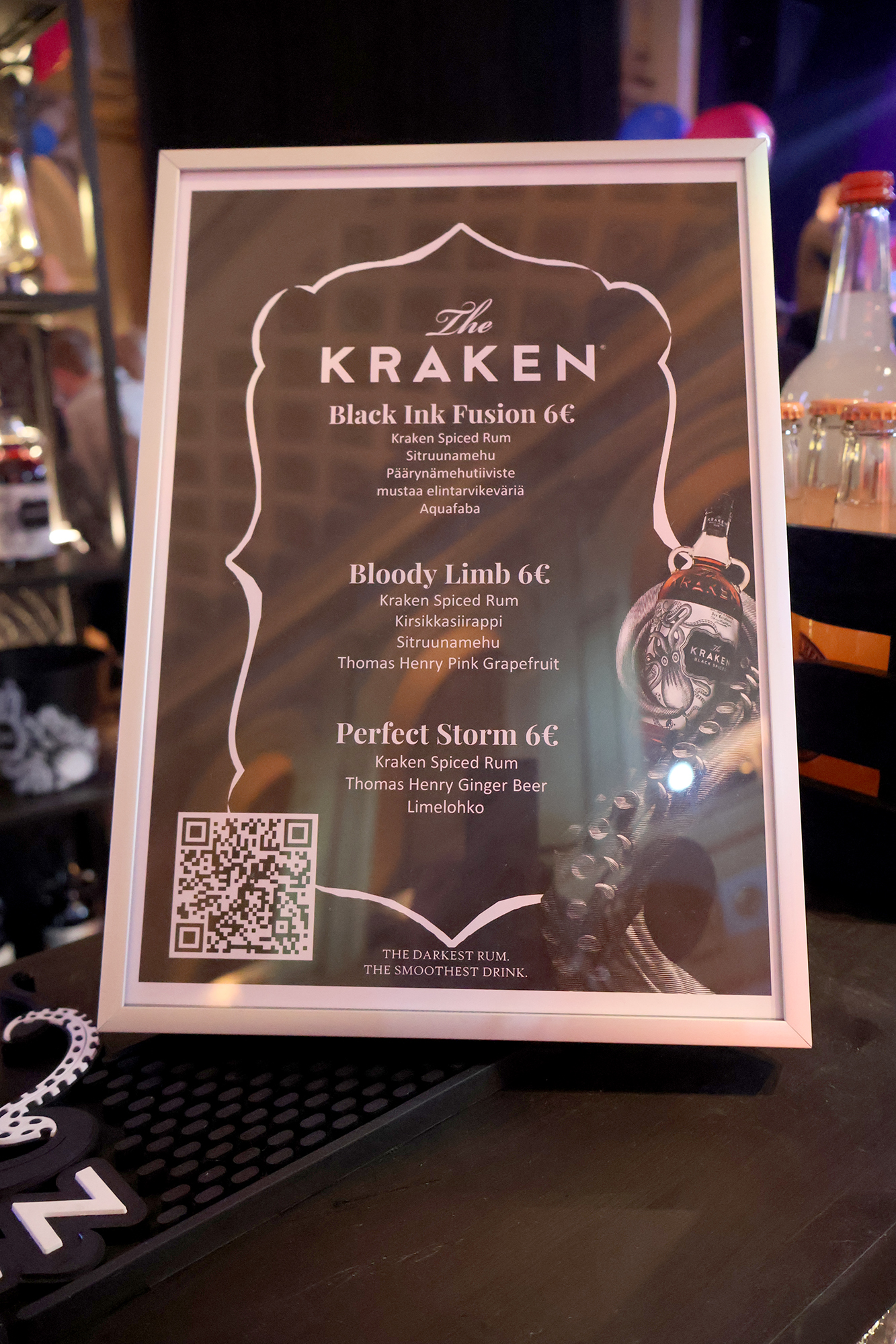 Tapahtumassa myytiin tällä kertaa ainoastaan puolikkaita drinkkejä 6 € hintaan. Tämä on hyvä asia, jos haluaa maistella useampaa drinkkiä illan aikana. Ainoa mahdollinen maksutapa tapahtumassa on korttimaksu. Minä maistoin neljän tunnin aikana 17 eri drinkkiä ja join jokaisesta noin 3/4 vaimon maistellessa sen puuttuvan neljänneksen. Jokunen drinkki taisi olla sellainen, jota en yhtä hörppyä pidemmälle “nauttinut”.