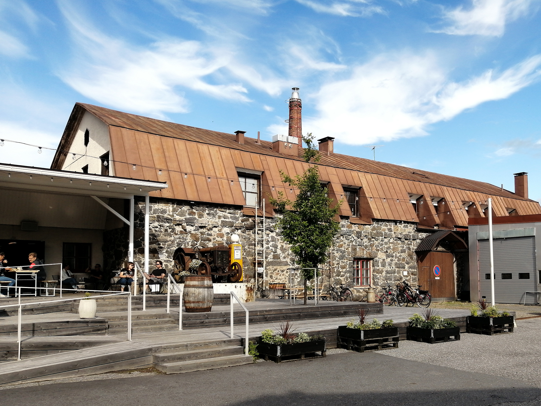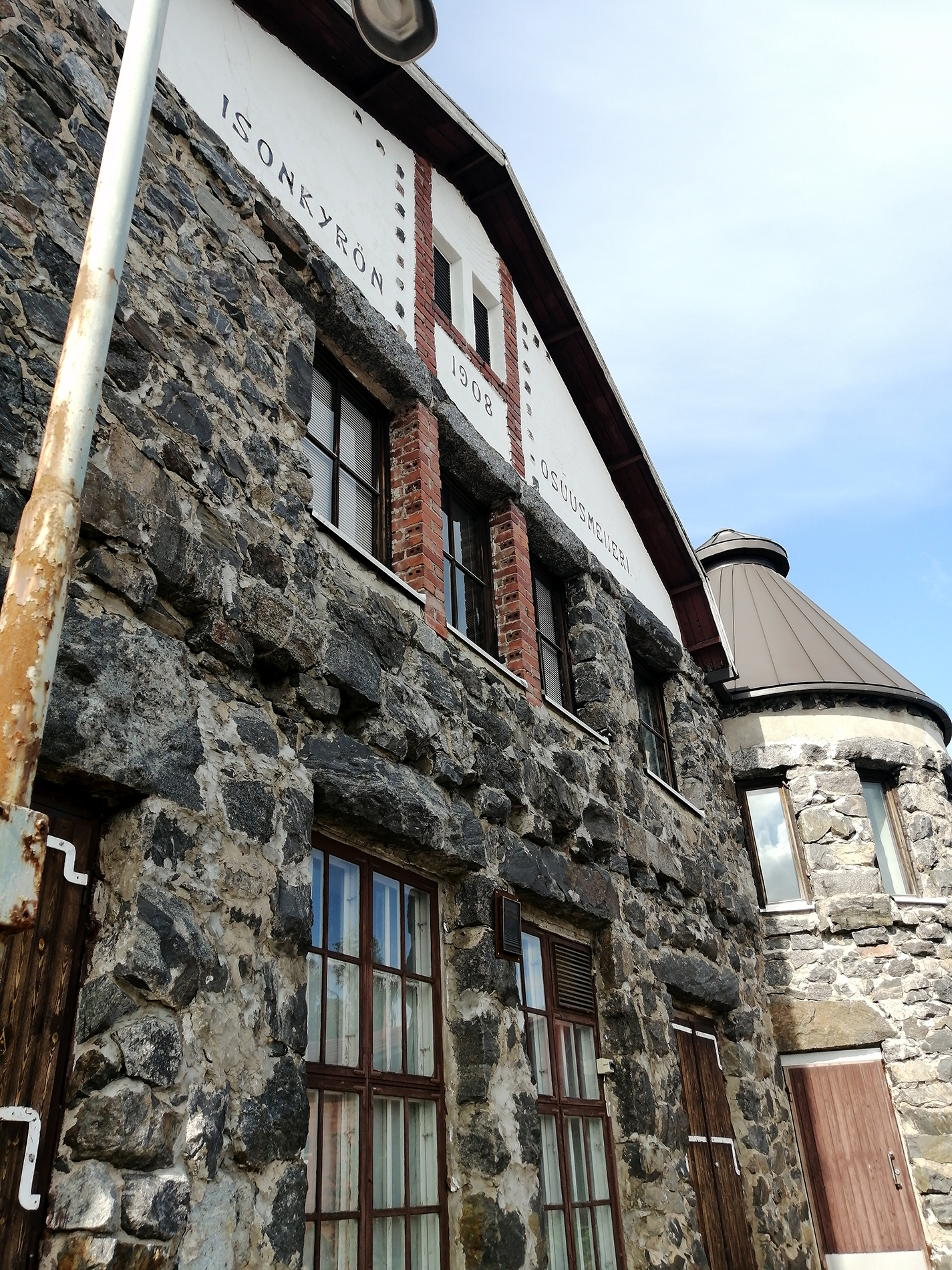 Isokyrössä, 35 km Seinäjoelta luoteeseen, keskellä peltoja ja pöpelikköä, sijaitsee yli 100-vuotiaassa entisessä meijerirakennuksessa tislaamo, jossa tislataan giniä ja ruisviskiä. Ainakin ginistä valmistetaan lisäksi miedompia juomasekoituksia. Ostin keväällä liput tislaamokierrokselle ja toivoin, että kesälomareissumme ajoittuisi juuri kyseisen päivän ympärille. Ajoittuihan se, kun itse sai suunnitella. Saavuimme Isokyröön Helsingistä Seinäjoen kautta, jossa kävimme sukuloimassa.
